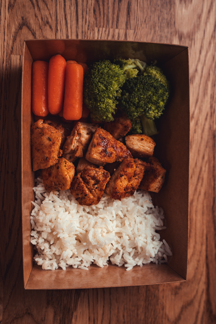 150 grams chicken breast, 100 grams white rice, 150 grams mixed vegetable