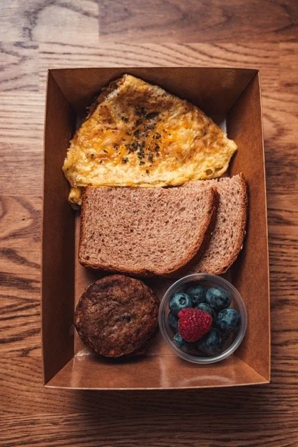 2 eggs, 100 grams fresh fruit, 1 slice of toast, 2 turkey sausage patties