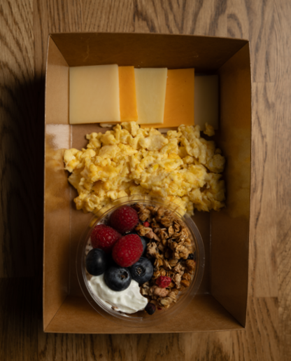 2 scrambled eggs, 100 grams mini yogurt bowl, 50 grams cheese