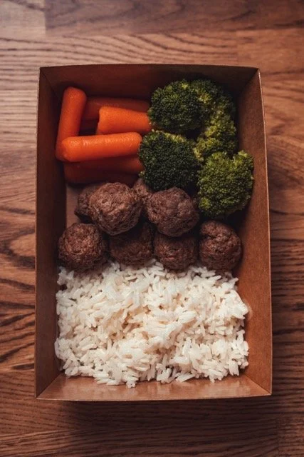 150 grams beef meatballs, 100 grams white rice, 150 grams mixed vegetables