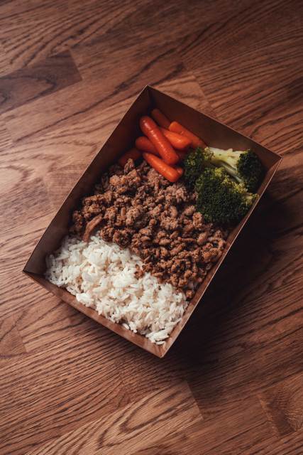 150 grams turkey meatballs, 100 grams white rice, 150 grams mixed vegetables