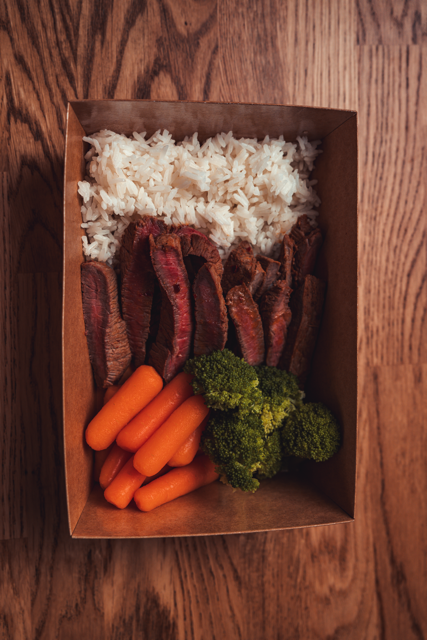 150 grams grilled sirlion steak, 100 grams white rice, 120 grams mixed vegetables