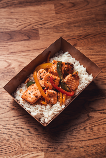 150 grams salmon, 100 grams white rice, 150 grams sweet peppers