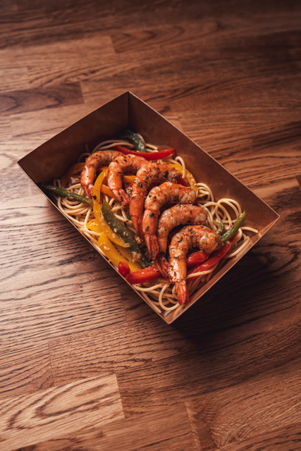 200 grams shrimp, 100 grams pasta, 150 grams sweet peppers