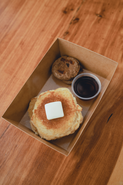 2 pancakes, Maple syrup, 68 grams turkey sausage patty